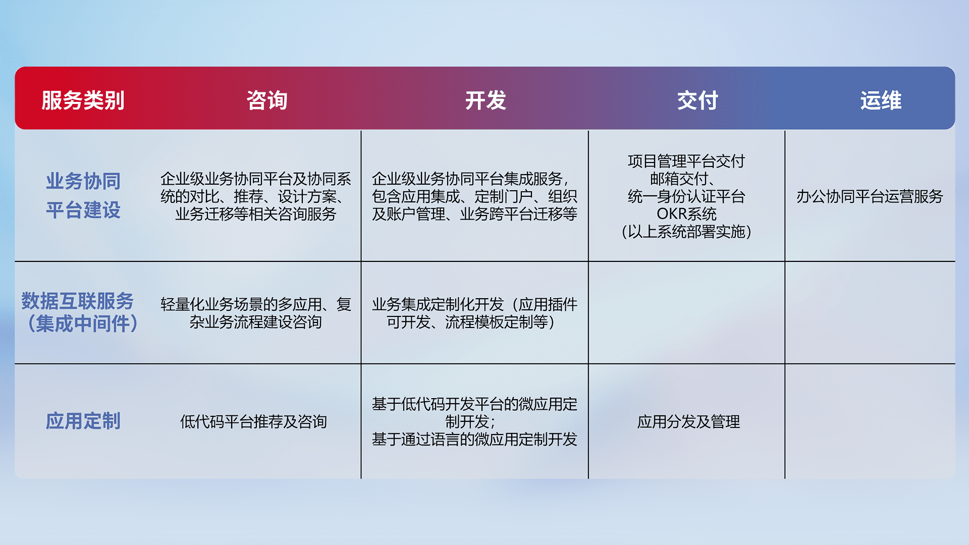 针对钉钉、、企微、、、、IDaas等平台级产品提供产品的规划、、、、方案、、、交付、、、、定制化开发等服务,,,实现如统一协同办公、、智能客户服务、、、、混合会议管理、、、智能数据查询、、、、等业务场景,,,,实现数字化转型。。。。